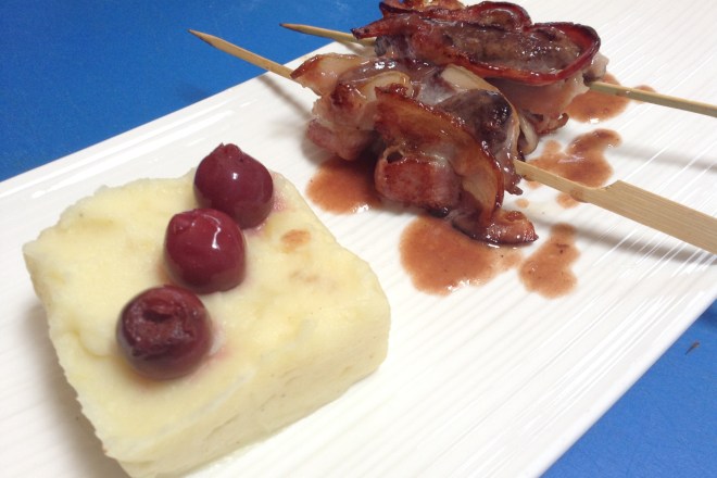 Repartir la salsa encima de los pinchos de pato y también sobre el puré de patatas.