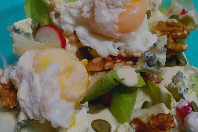 Decidí preparar una ensalada con estas sobras y añadí unas nueces, una semillas de girasol mientras pochaba 2 huevos en agua con un chorro de vinagre.