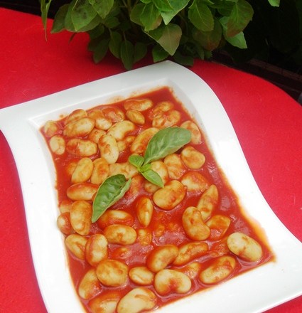 Una de las recetas que me encantan allí es «los gigantes en salsa de tomate y albahaca fría».