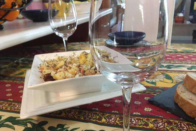 Una vez terminadas las preparaciones, los alumnos se juntaron alrededor de la mesa para comer todos los tartares y disfrutar de un momento de gastronomía compartida con Mariola, la anfitriona, siempre generosa en distribuir copas de vino a todos.