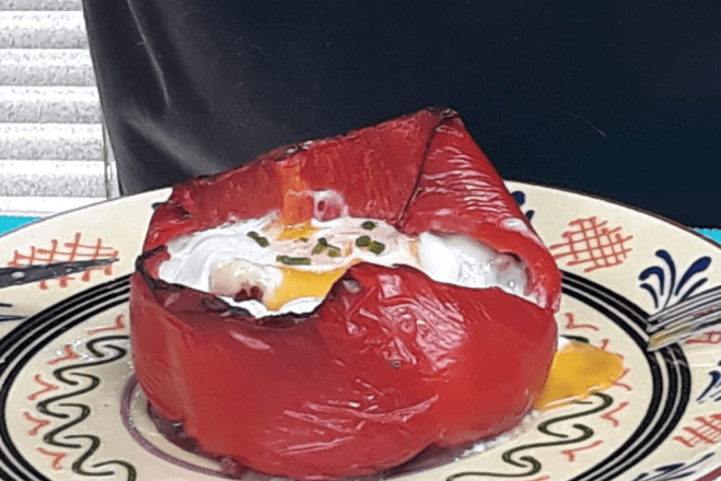 Cortar una parte arriba y quitar las pipas. Rellenar el pimiento con el arroz mezclado con los taquitos de jamón, añadir el queso rallado y encima de todo, echar el huevo.